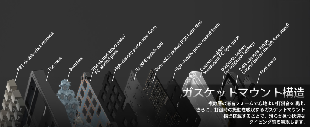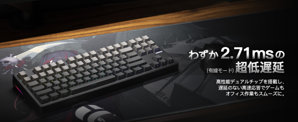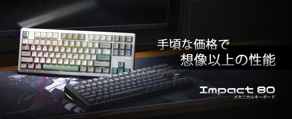 Impact80 JIS配列絶賛販売中 有線2.71msの超低遅延とデュアルチップ構成により、瞬時の入力レスポンスを実現。さらに、ガスケット構造・大容量バッテリー・3Way接続・ARGBライティングを搭載し、スピードと安定性を徹底的に追求した80%キーボードです。 Amazonにて好評販売中 多くのご要望を受け、Impact80は現在Amazonにて販売を開始いたしました。 さらに、日本市場向けにJIS配列モデルも新たに展開しております。これまで海外配列のみだった本モデルに、日本語入力に適したJIS仕様を追加することで、より多くのユーザーに安心してご使用いただけるようになりました。Amazonでのご購入により、迅速な配送やカスタマーサポートにも対応。 初めての方でも安心してお選びいただけます。 Years of Experience 0 + Happy Clients 0 k+ Satisfaction 0 % Find out more Impact80は、15,000円以下という手に取りやすい価格ながら、2.71msの超低遅延、3モード接続、大容量バッテリー、ガスケット構造、270°ARGBライティングなど、充実した機能を搭載した80%キーボード。 さらにVIAによる自由なキーマッピングに対応し、用途や好みに合わせた自由なカスタマイズが可能。 ゲームでも作業でも快適に使える性能を、この価格帯で実現。 性能・機能・デザインのすべてをバランスよく備えた、高いコストパフォーマンスを誇る80%キーボード。 商品詳細 有線モードではわずか2.71msの超低遅延を実現。反応速度・打鍵感・ライティング――そのすべてを妥協なく追求した、完成度の高い80%キーボード。 有線接続時わずか2.71msの超低遅延有線接続時、わずか2.71msの超低遅延を実現。高性能デュアルチップを搭載し、入力から画面反映までのタイムラグを最小限に抑えます。ゲーム中の一瞬の操作から、オフィスでの高速タイピングまで、ストレスなくスムーズに対応。“押した瞬間に応える”ダイレクトな打鍵感を体感いただけます。 どんな環境にも、即対応。有線 / 2.4GHz / BTの3Way接続に対応。Windows・Macの両OSをサポートし、本体上部のスイッチ操作だけで接続モードを瞬時に切り替え可能です。デスクトップPC、ノートPC、タブレットなど、複数デバイス間の切り替えもスムーズに行えます。 8000mAh / 4000mAh の大容量バッテリーを搭載。8000mAhモデルでは最大約90日間の使用が可能。長時間使用を前提に設計された、余裕のあるパワー設計により、頻繁な充電から解放され、ワイヤレス環境でも安心して使用できます。 滑らかで心地よい打鍵感。内部には複数層の消音フォームを配置し、不要な反響音を抑制。さらに、振動を吸収するガスケットマウント構造を採用。打鍵時の衝撃を和らげることで、音・振動・指先のバランスのよい感触と、滑らかで快適なタイピング感を実現しています。 鮮やかなARGBライティングバックライト、ロゴライト、そしてケースフレームを囲むサイドライトを組み合わせにより、没入感のあるライティングを実現。ライティングのエフェクト、カラー、彩度、明るさなども細かく調整可能で、自分好みにカスタマイズできます。 最大3段階の角度調整背面には2段階のチルトスタンドを備え、フラットを含めて最大3段階の角度調整が可能。作業内容や姿勢に合わせて、最適なポジションに角度を調整することで手首への負担を軽減し、長時間のタイピングやゲームプレイでも快適に使用できます。日常使いから集中作業まで、幅広いシーンに対応可能です。 製品サイズ:36.4 x 14 x 3.3 cm; 1.1 kg電池 :非標準バッテリ 電池(付属)カラー:Mist/Cheese Switch/PCプレート(日本語配列)・ガスケットマウント ・3WAY接続 ・わずか2.71msの超低遅延 ・3段階調整可能な角度